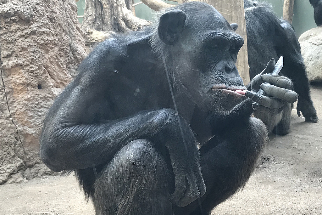 Für mehrere Wochen führten die Primatologinnen des Max-Planck-Institutes Leipzig, Dr. Sonja Ebel und Dr. Kathrin Susanne Kopp, Forschungen bei unserer 10-köpfigen Schimpansengruppe durch und machten dabei sehr interessante Beobachtungen zur Selbsterkennung im Spiegel. Selbsterkennung im Spiegel (engl. Mirror self-recognition, MSR) gilt als Indikator für die Selbstwahrnehmung. Standardisierte Spiegeltests zeigen überzeugende Beweise für MSR u.a. bei Schimpansen. Kathrin Kopp und Kollegen beobachteten, dass die Schimpansen mehr auf Selbsterkennung hindeutendes Verhalten mit kleinen Handspiegeln als mit großen Wandspiegeln zeigten – eine wichtige Erkenntnis für das weitere Studium der Selbstwahrnehmung von Tieren. Die gewonnenen Daten aus dem Zoo Magdeburg wurden in der jetzt veröffentlichten Studie zur Selbsterkennung im Spiegel bei Schimpansen im Journal Animal Behavior and Cognition 2021 wissenschaftlich ausgewertet. Die Forschungen des Max-Planck-Instituts Leipzig im Zoo Magdeburg werden fortgesetzt.